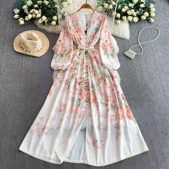 महिलाओं के लिए फ्रेंच विंटेज मिडी वसंत/शरद ऋतु-लाइन वी-गर्दन टाई-अप कमर एकल बटन मुद्रित लंबे स्कर्ट चौड़े हेम