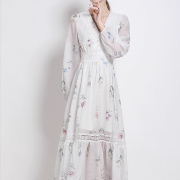 فستان متوسط الطول أنيق بتصميم فرنسي عتيق على الطراز الإمبراطورية خصر زهور خريفي رقبة حرف V دانتيل مرقع مطبوع عليه فستان متوسط الطول مريح منسوج