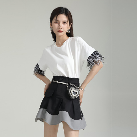 Maglietta da donna nuova maglia con polsino in piuma allentata a maniche corte a maniche corte Top girocollo in offerta all'ingrosso